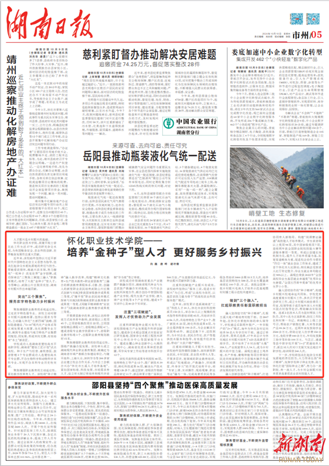 注重培训赋能人才振兴有担当。该校始终坚持德技创融合,面向新型职业农民、乡村创客、农业技术带头人等,开展多层次、宽领域的职业教育培训,形成以“校地联动、产教融合、田间课堂、终身学习”的开放式培育平台,将“专家上课、实训操作、现场观摩、职业考证”融为一体,完成高素质农民等各级各类培训3000余期33.5万人次,培养基层农技特岗生588名,毕业生覆盖湖南省近100个县、市、区。获批全国第一批乡村振兴电商人才培养示范基地暨村村播工程示范校共建单位。