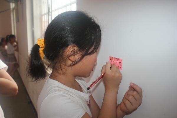 小朋友们写下了自己的愿望或者是给自己爱的人的一些话。志愿者学生也写下了对这些小朋友的愿望祝语,比如杨飞燕同学的“志存高远”、陈朝美同学的“愿你们快乐成长”等等简短却又美好的祝福。